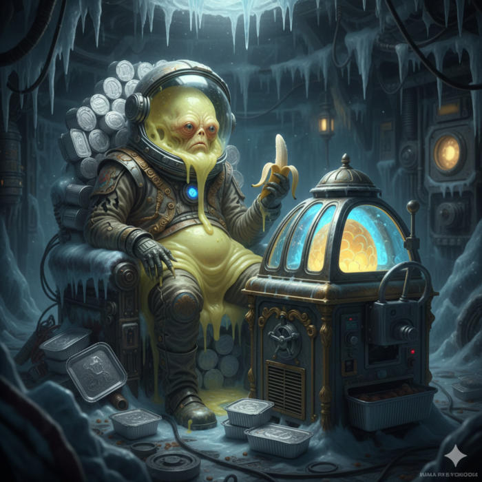 - Beschreibung: Eine eisige Höhle. Das Alien S’lorp thront auf gefrorenen Lebensmittelcontainern vor der glühenden Galaktischen Gelateria 3000 (dem „Ei“). Er schluchzt leise.