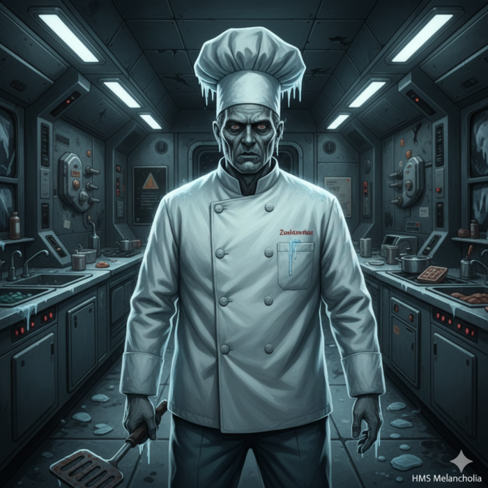 - NSC: Zombie-Koch Gisbert Löffler (ST 12, GE 8, WI 6, 6 LP). Er murmelt obsessiv über „die perfekte Cremigkeit“ und greift Spieler mit einem Rostigen Spachtel (1W6) an. Er ist in einem weißen Kochoutfit, das mit getrocknetem Schleim und Eis überzogen ist.