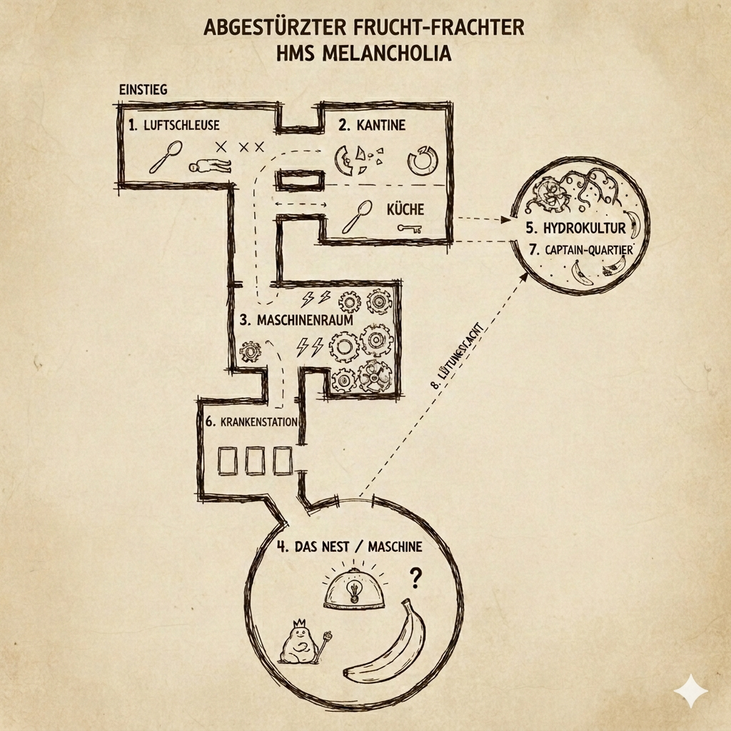 - Szenario C (Betrug): Die SC füttern S’lorp mit Gisberts „Frostschutz-Sorbet“. S’lorp erleidet einen qualvollen Zuckerschock und explodiert in einer Kältewelle (1W12 Schaden für alle im Raum). Das Schiff wird instabil.